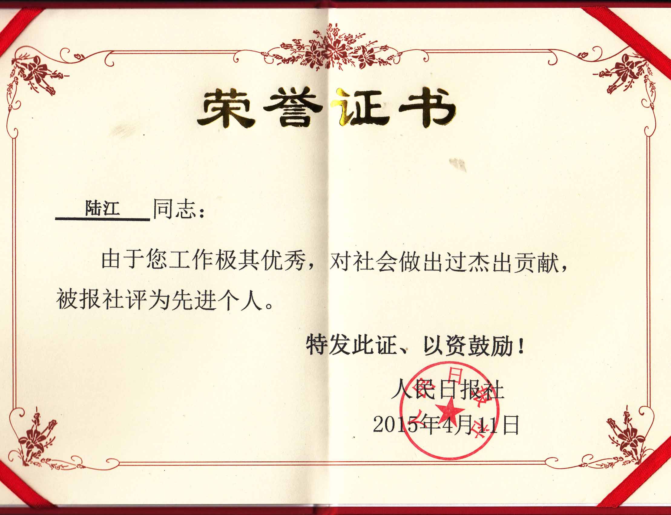 陸江的杰出貢獻(xiàn)被人民日報社評為先進(jìn)個人